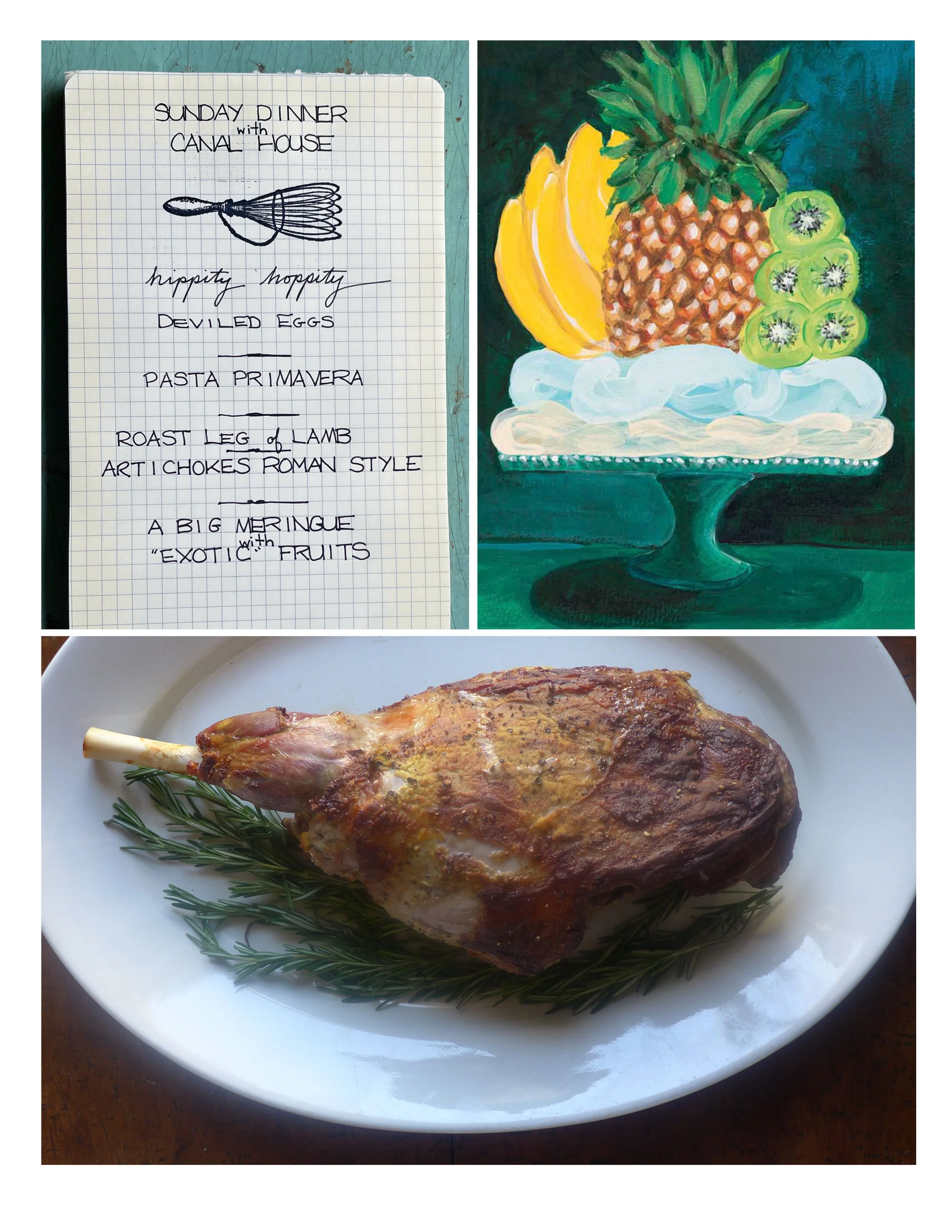 Counterclockwise from top left: Easter Sunday Dinner menu; Roast Leg of Lamb; A Big Meringue with “Exotic” Fruits